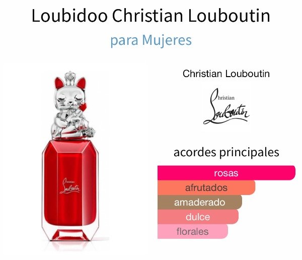 -Loubidoo de Christian Louboutin es una fragancia de la familia olfativa Floral Frutal para Mujeres. Loubidoo se lanzó en 2020. La Nariz detrás de esta fragrancia es Daphné Bugey. La Nota de Salida es fresa; la Nota de Corazón es rosa; la Nota de Fondo es cedro.