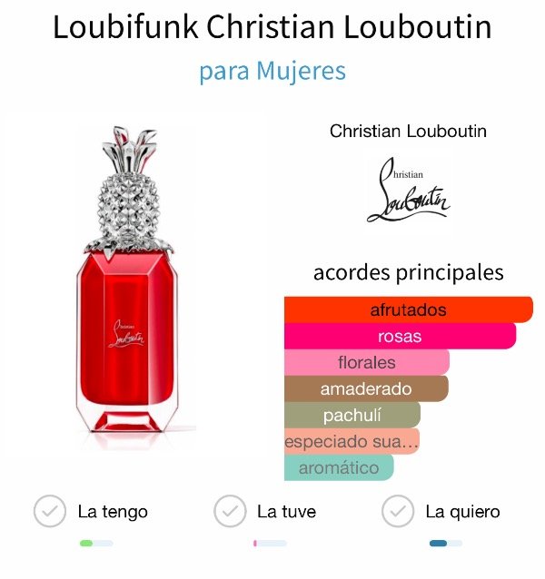 -Loubifunk de Christian Louboutin es una fragancia de la familia olfativa Chipre Floral para Mujeres. Loubifunk se lanzó en 2020. La Nariz detrás de esta fragrancia es Nicolas Beaulieu. La Nota de Salida es grosellas negras; la Nota de Corazón es rosa turca; la Nota de Fondo es pachulí.
