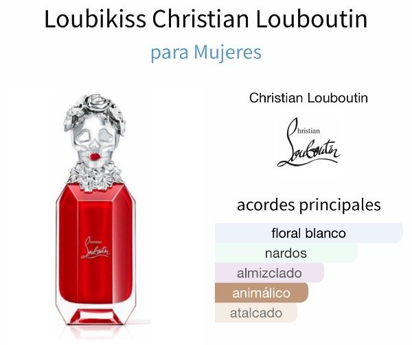 -Loubikiss de Christian Louboutin es una fragancia de la familia olfativa Almizcle Floral Amaderado para Mujeres. Loubikiss se lanzó en 2020. La Nariz detrás de esta fragrancia es Daphné Bugey. La Nota de Salida es jazmín; la Nota de Corazón es nardos; las Notas de Fondo son almizcle y notas amaderadas.