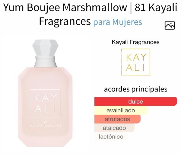 Yum Boujee Marshmallow | 81 de Kayali Fragrances es una fragancia de la familia olfativa Floral Frutal Gourmand para Mujeres. Esta fragrancia es nueva. Yum Boujee Marshmallow | 81 se lanzó en 2024. La Nariz detrás de esta fragrancia es Gabriela Chelariu. Las Notas de Salida son fresia, limón italiano (lima italiana), flor del nectarino y manzana; las Notas de Corazón son malvavisco (bombón), fresa, coco y flor de azahar del naranjo; las Notas de Fondo son crema batida, azúcar, vainilla, almizcle, frambuesa y ambroxan.